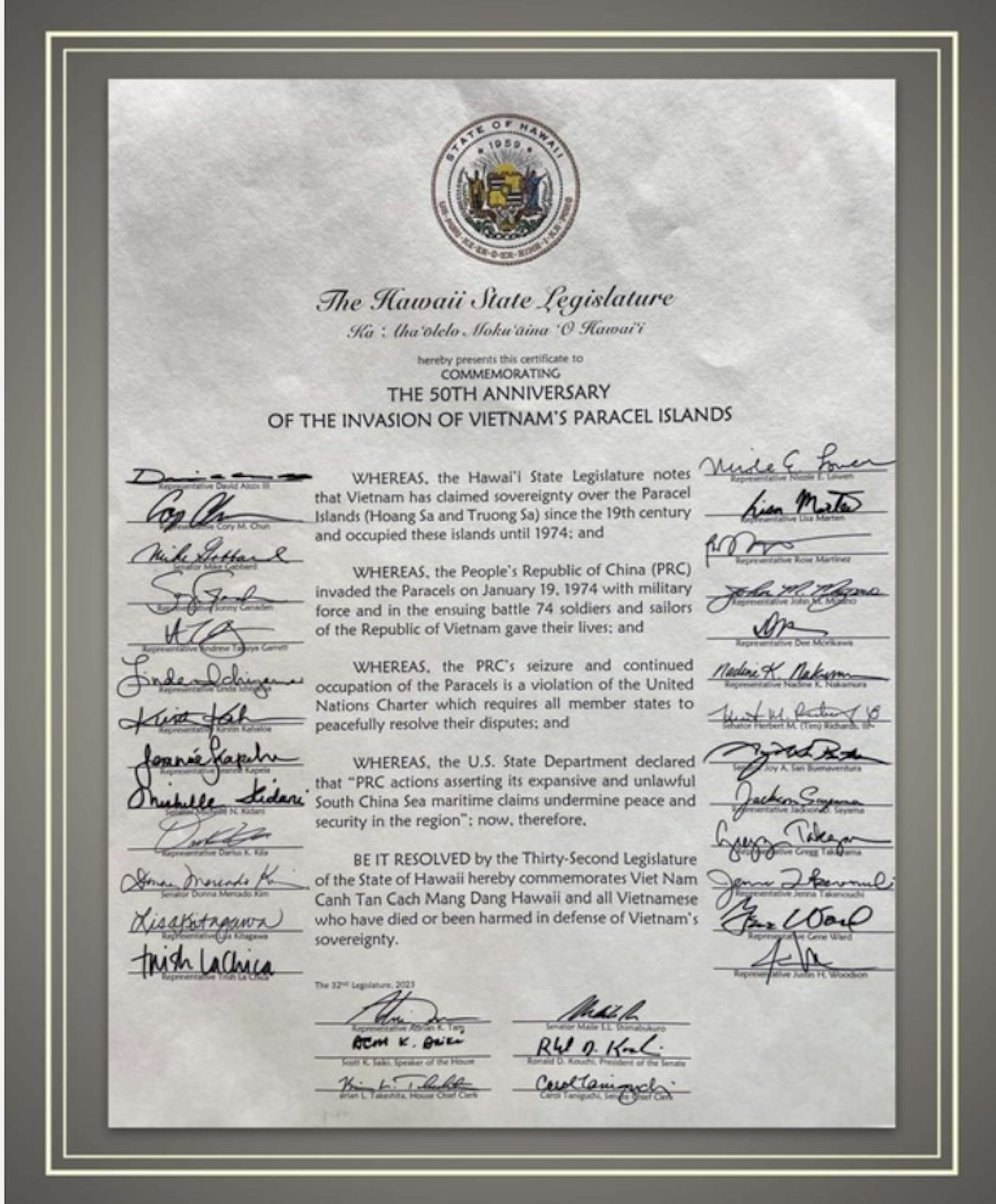 Chủ tịch Hạ Viện Scott Saiki và Chủ tịch Thượng Viện Ronald Kouchi của Tiểu bang Hawaii, Hoa Kỳ, đã cùng 30 Dân biểu và Thượng nghị sĩ khác ký tên ban hành bản “Chứng nhận đánh dấu 50 năm Quần đảo Hoàng Sa của Việt Nam bị xâm lược”.